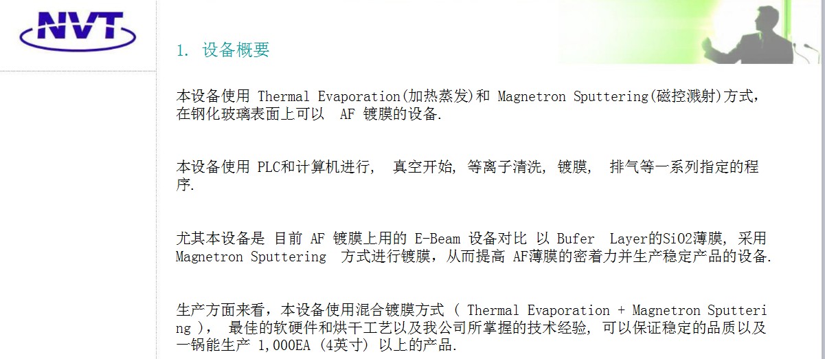 簡(jiǎn)述: 本設(shè)備使用 Thermal Evaporation(加熱蒸發(fā))和 Magnetron Sputtering(磁控濺射)方式,在鋼化玻璃表面上可以 AF 鍍膜的設(shè)備.